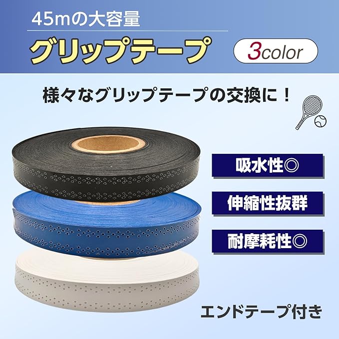 グリップテープ テニス 45m 大容量 エンドテープ付 滑り止めテープ 防水 汗対策 ラケット バドミントン ゴルフ 野球 自転車 釣り竿 交換用