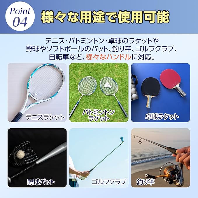 【カット自在・装着簡単な汎用デザイン】テニス・バドミントンなど各種ラケットやハンドルに合わせて自由にカット可能。裏面の粘着層でズレにくく、初心者でも簡単に取り付けられます。付属のエンドテープで美しく仕上がり、巻き直しや交換もスムーズに行えます。