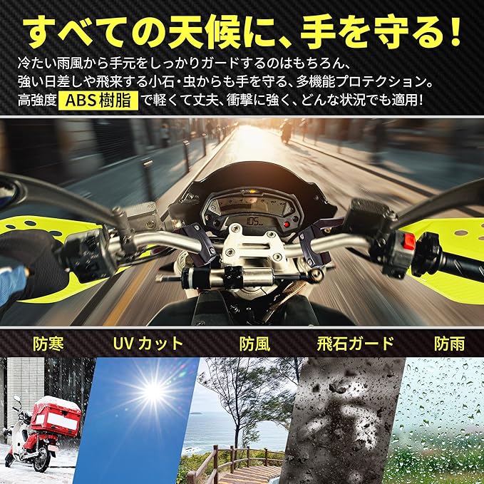 【どんな天候にも応えるハンドガード】サイクリング中の手が受ける雨、寒、風、紫外線、飛散する砂利にまだ悩まされていませんか?当社のハンドガードは、まさにこの課題を解決する「五重の守り」を実現します。採用素材には耐水性と防風性を兼ね備えた高機能素材で、突然の雨や冷たい風から手を守ります。さらに、紫外線カット加工により、長時間の日差しから肌を保護します。一つの装備で、季節や天候を問わず、楽々なサイクリングを楽しみ。