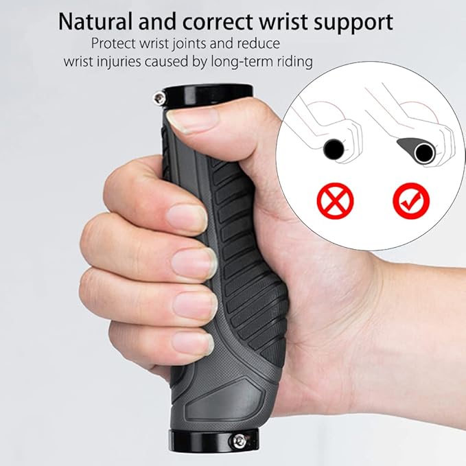 【エルゴ設計】 人間工学に基づいた設計され、円筒形のグリップより手首への負担を最小限に抑えられ、長時間の走行でも疲れにくいです。自転車での通勤や長距離のサイクリングには特におすすめです。