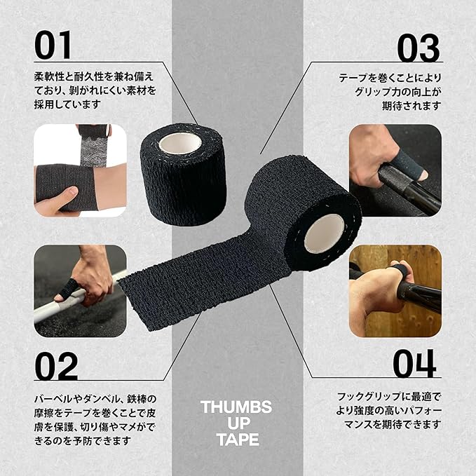 親指以外の指にももちろん使用することができ、クロスフィットや重量挙げなどのバーベルやダンベル使用時の摩擦をテープがほごしてくれます。