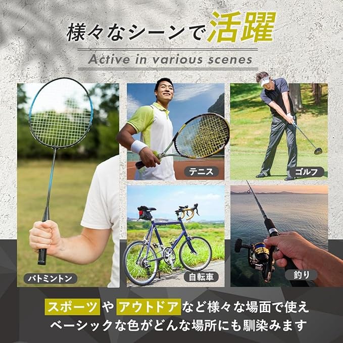 【様々なスポーツ&アウトドアに対応】テニス・バドミントンはもちろん、ゴルフ、釣り、自転車など幅広いシーンで活躍。汗をかいても滑らず、安定したプレーをサポートします。