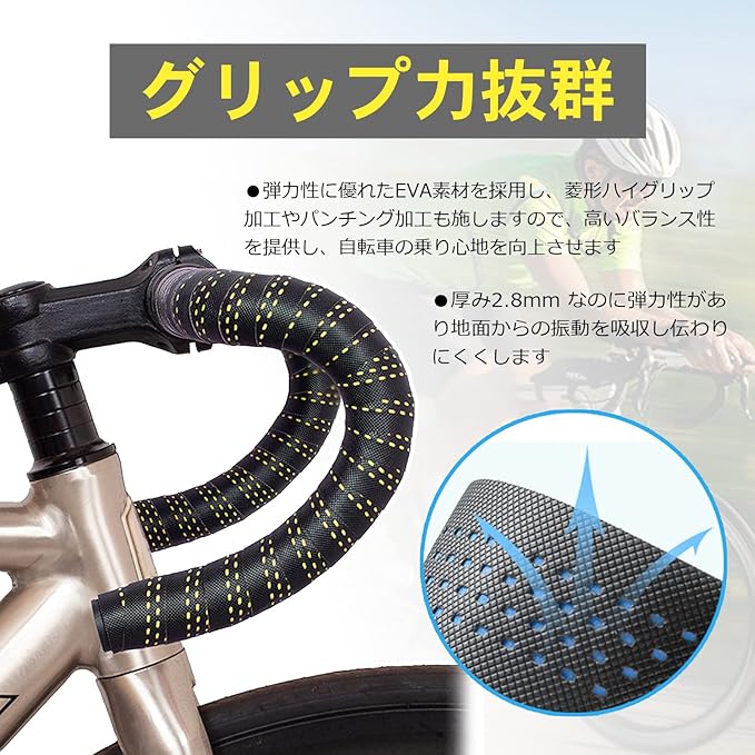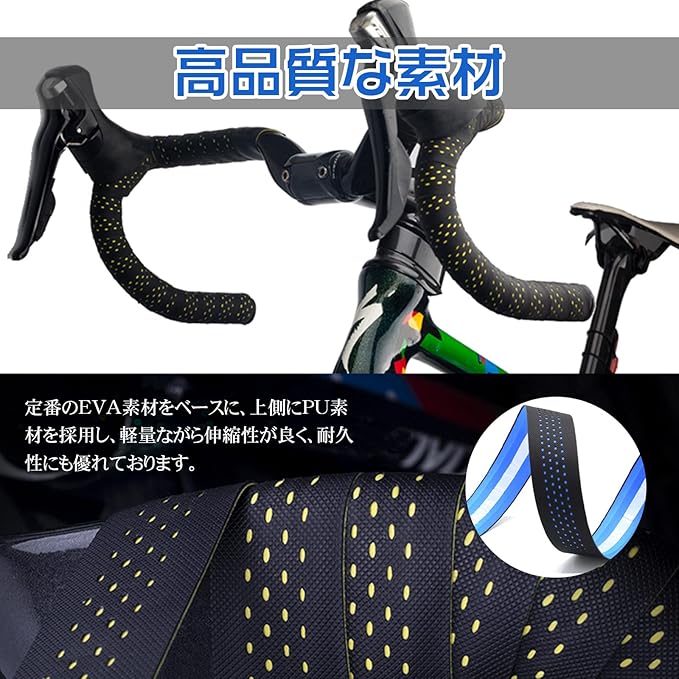 【高品質な素材・グリップ力抜群】 定番のEVA素材をベースに、上側にPU素材を採用し、菱形ハイグリップ加工やパンチング加工を施したロードバイクバーテープなので、適当なクッション性と優れた操作性を発揮します。軽量ながら伸縮性が良く、耐久性にも優れており、表面滑り止め加工を施したバーテープは、高いバランス性を提供し、自転車の乗り心地を向上させ、グリップ力抜群です。