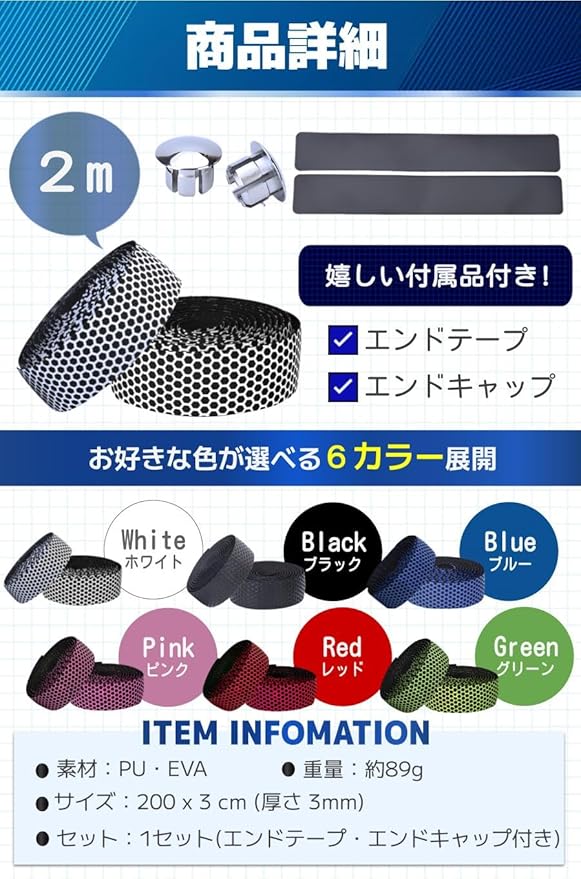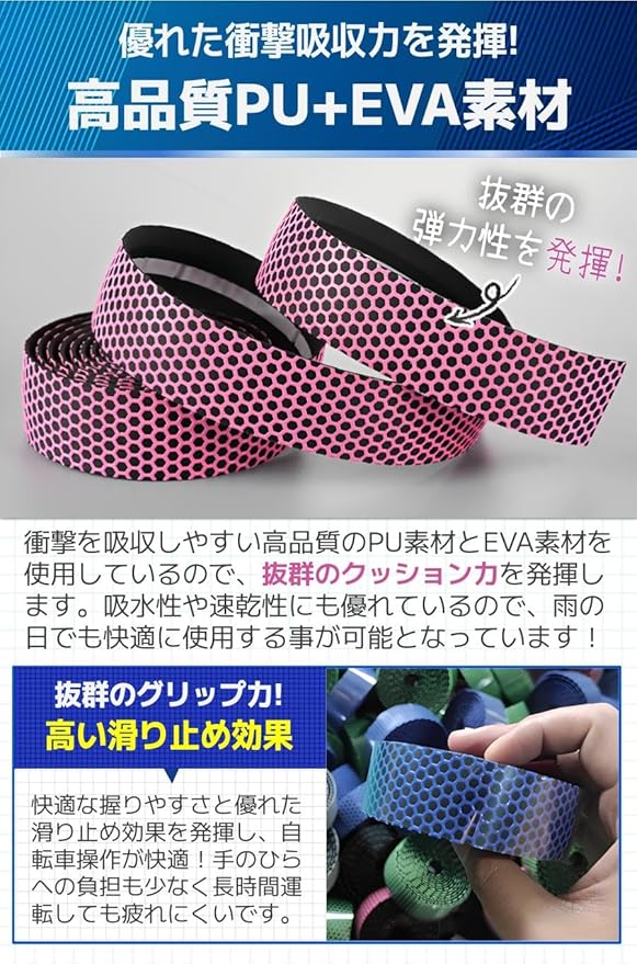 【商品特徴】①取り付け方法簡単!:裏面がシールなので工具不要で使用可能/②快適な握り心地:滑り止め効果により抜群のグリップ力/③汎用性抜群のテープ:自転車・釣り竿・椅子の肘掛けなど多用途/④嬉しい付属品付き:エンドキャップとエンドテープ付き!