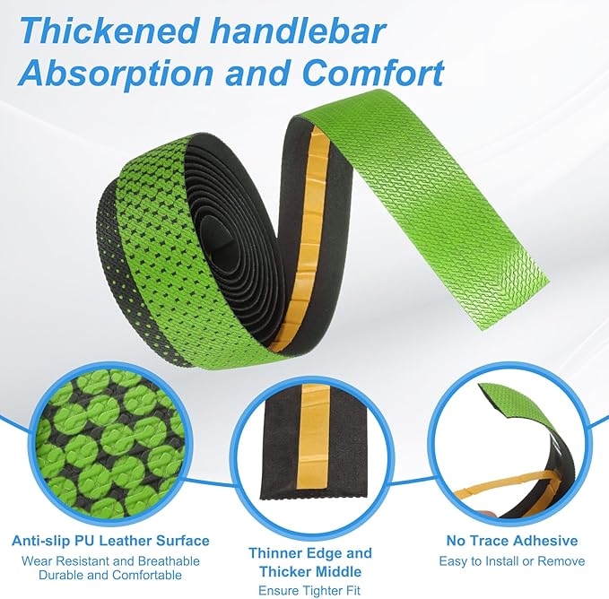 PUレザー(表面)/ EVAフォーム(裏地)から作られた自転車ハンドルバーラップは、優れたグリップ、衝撃吸収、耐久性を提供し、乗車中の心地よいさとパフォーマンスを向上させます。