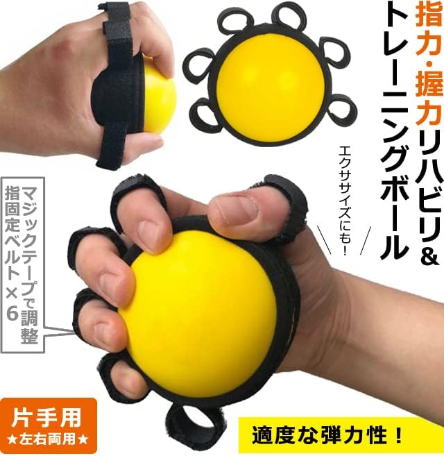 指力と握力を鍛える!リハビリに、筋力強化のトレーニングに、エクササイズに!ホールド力を鍛え、柔軟性を向上、疲労緩和にも効果を発揮します。指はめ部分はマジックテープ式で装着時の調整が可能ですので、しっかり固定でき、お子様から高齢者まで、幅広い年齢層の方にお使いいただけます。(手の大きさがボールのサイズに合わない場合は握れませんのでご注意下さい。)
