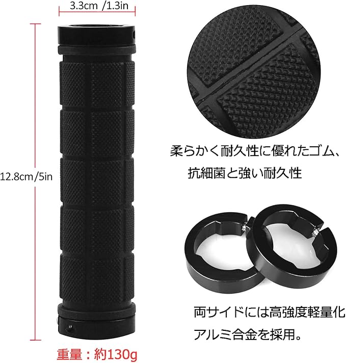 サイズ:128x33mm 対応内径:22.2mm 重量:約135g パッケージ 内容: ハンドルグリップ*1ペア 、エンドキャップ*1 ペア、 六角レンチ 1個(六角レンチ付属して、ねじを締めて取り付け可能です。)