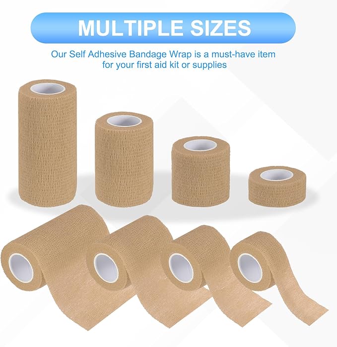 カラー:ライトスキン;素材:不織布;長さ:177"(450 cm);4つの幅:1"(2.5 cm)、2"(5 cm)、3"(7.5 cm)、4"(10 cm);梱包リスト:16個 x セルフアドヘーシブバンデージラップ(1個ごとの仕様)