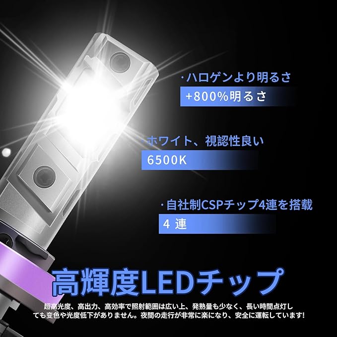 【H11 LED車検対応 高輝度 ヘッドライト】 本品はh11 LEDバルブ専用設計。高品質CSP LEDチップを搭載し、従来のハロゲンランプ比で約8倍の明るさを実現。6500Kの純白光束が夜間の視界をクリアに照らし、運転の安全性を飛躍的に向上させます。