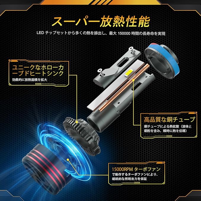 主な仕様出力:1 個あたり 120W、強力な照明を実現光束:20000LM、高輝度を実現モデル詳細:最新の 9890 CSP チップを採用、12 個の両面ヘッドランプコア搭載色温度:6500K素材:独自の中空カーブヒートシンク、高品質な銅チューブによる放熱構造搭載;広面積メタルフィンデザインIP レーティング:IP68 相当(想定)‐ 水・粉塵から完全密封、全天候対応の信頼性動作電圧:DC9 - 18V、12V 車両システムに適合動作温度範囲:‐40℃ ~ +80℃、極限環境でも動作可能な設計寿命:待機時間 60000 時間以上、頻繁な交換不要特長視認性強化:360 調整式マウントブラケットにより、適切なビームパターンと強力な集光効果を実現;ハロゲン比 800%明るく、安全運転に貢献耐久性とデザイン:超高放熱設計(独自中空カーブヒートシンク、高品質銅チューブ、15000RPM ターボファン、新フィン&ファン放熱構造)で長寿命・高性能を両立;外部スマートチップ搭載の一体型設計簡易取付:360 調整式ベースで取付容易、プラグアンドプレイ想定取付時の注意事項付属保護手袋の使用:取付時は必ず付属の手袋を着用し、損傷や汚染を防止してください互換性確認:Amazon フィルターシステムで相違が表示される場合、当社専用サポートをご利用ください
