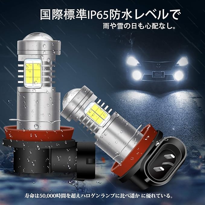 ●【6500K白光&高ルーメン】LED フォグランプ H11 DC 12V専用。上部は凸レンズ付きで には3連のLEDチップ、照射距離が遠く、光が集中して分散しない。側面には3面発光の全方位照射を行った。雨や霧のときも見通しやすい!