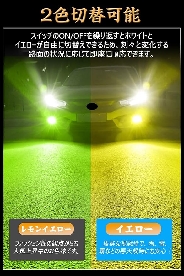 h11 led フォグランプ 爆光 2色切替 車検対応 H8 H9 H16JP h11 led フォグ H8 LED フォグ h16 LEDフォグランプ h9 led 高輝度 3570 CSPチップ 12V 車用 無極性 LEDバルブ 車/バイク用 取付簡単 瞬間起動 50000時間以上寿命 2個入り (レモンイエロー+イエロー)