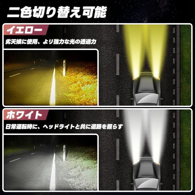 LEDフォグランプ H8/H11/H16対応 2色切替式 (ホワイト/イエロー) 車検対応 IP68防水 結露防止 無極性設計 信頼性テスト 2個セット