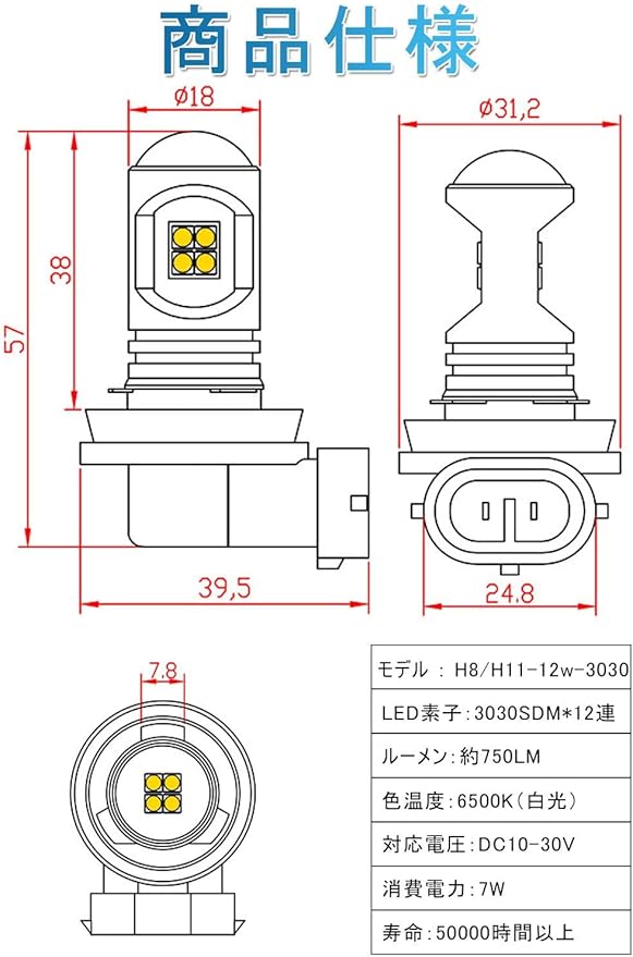 超高輝度 全方位照射:このh11 ledフォグランプ超高発光効率の3030SMD LED素子12連搭載。上部は4連、周りは8連、拡散レンズ付きで光線を集中でき、照射距離を増やせる、本気の360 全方位照射でき。市販のハロゲンより省エネルギーの上で、明るさは大幅にアップ!