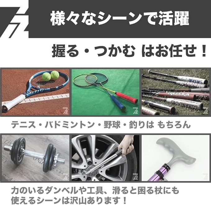 【様々な用途でお得】テニスやバトミントン、ゴルフのグリップに。釣り具、ダンベル、野球のバットにも。農機具、工具、杖のすべり止めに。重たいものを持ち上げる時のすべり止め、細くて握りにくいものを持ちやすく。スポーツ用品から、日常仕様まで様々な用途にご使用いただけます。