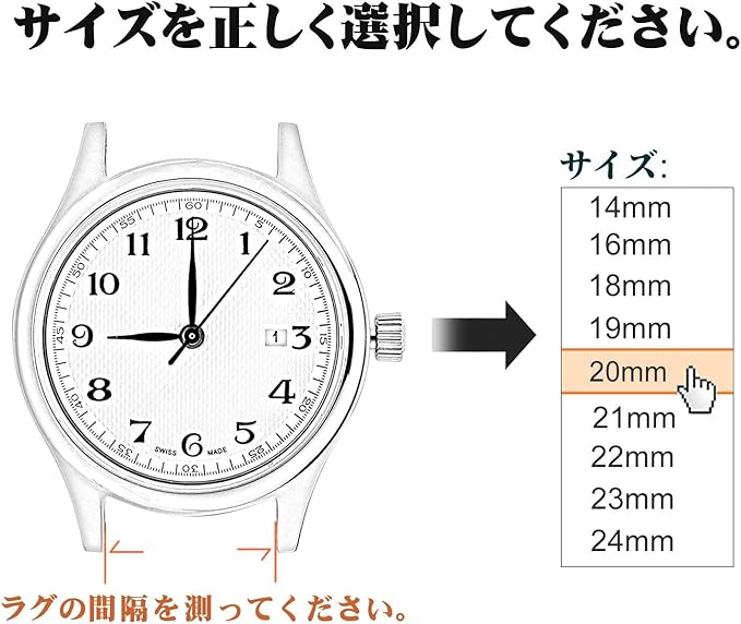 この時計バンドはラグ幅24mm のバネ棒(スプリングバー)を使う伝統的な腕時計やスマートウォッチに適用します。