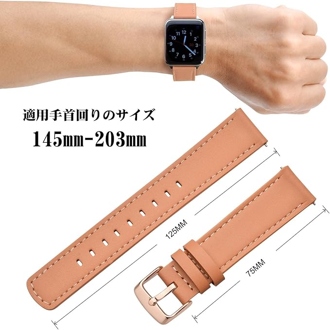 バンド長さは125mm/75mm(美錠を含めず)、適合手首囲は145mm~203mmです。