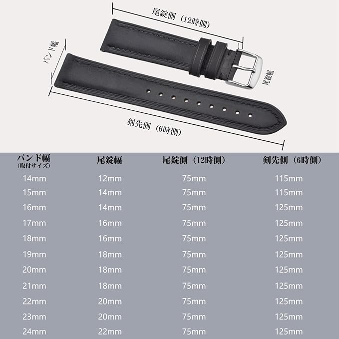【パッケージ内容】 1*腕時計ベルト、1*時計ベルトバネ棒外し、4*バネ棒 ラグ幅 14mm、15mm、16mm、17mm、18mm、19mm、20mm、21mm、22mm、23mm、 24mmの腕時計やスマートウォッチに適用します。 【ご注意】 本革ですので、水濡れや長時間の使用には色褪せなどの状況が避けられません。直接に水に浸透しないでく ださい。
