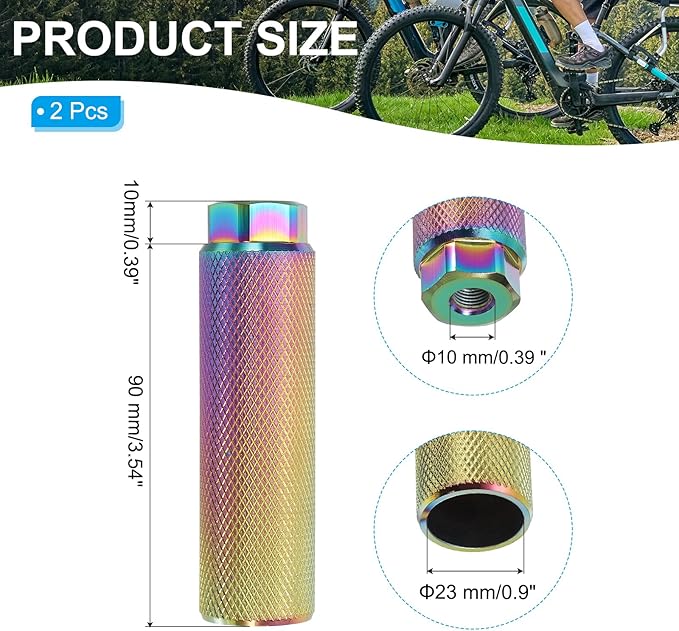 自転車ペダル9mm(3/8インチ)シャフト対応。BMX、マウンテンバイク、一般自転車用に設計されており、前輪および後輪のアクスルに取り付け可能で、しっかりしたサポートとストッピングを提供します。仕様カラー:カラープレーティング材質:アルミニウム合金全体サイズ:100x28mm/3.9x1.1インチ(長さx幅)口径:9mm/3/8インチパッケージ内容:2個バイクペグ利点フットバイクペグは耐久性、心地よい性、信頼性に優れ、最大200ポンドまで対応可能です。前後アクスルに対応し、工具などの持ち運びも簡単で、両足サポートを提供します。取り付け方法バイクの後輪アクスルにペグを取り付ける場合、アクスルの長さが5mm(0.2インチ)以上あることを確認してください。長さが足りない場合は、アクスルのネジを外し、ペグを取り付けて心地よい性を確保してください。注意:定期的にペグの状態と締め付け具合を確認し、心地よいで確実な使用を心がけてください。