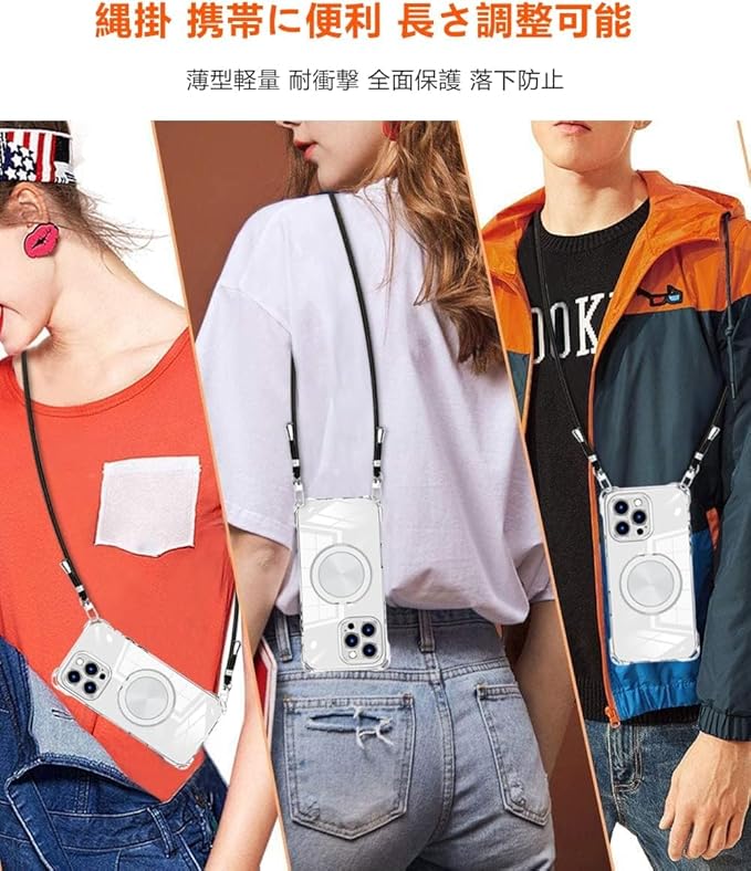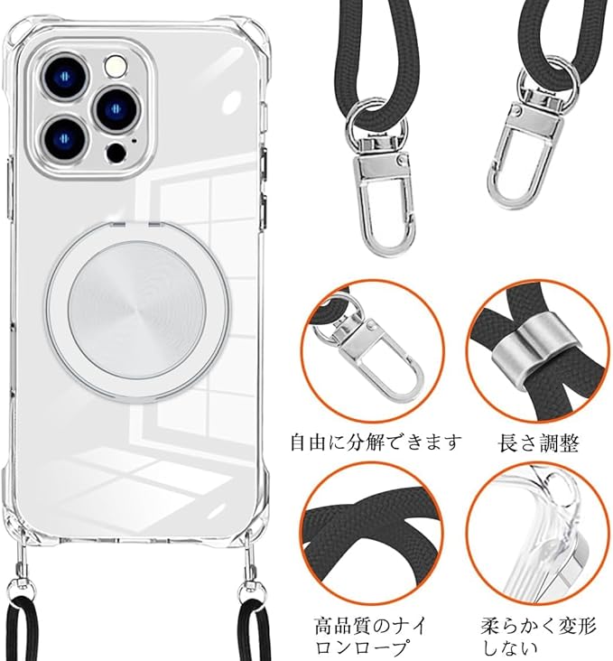 iPhone 17 Pro Max 用 ケース クリア MagSafe対応 リング スタンド 360度回転できる ワイヤレス充電 ネック ショルダー あいほん 17 pro max カバー 肩掛け 首掛け 斜めがけ 紐付き 韓国 耐衝撃 米軍MIL規格取得 スタンド機能 縦横両対応 落下防止 透明 TPU 薄型 軽量 黄変なしスタンド機能車載対応 アイフォン 17 promax スマホケース