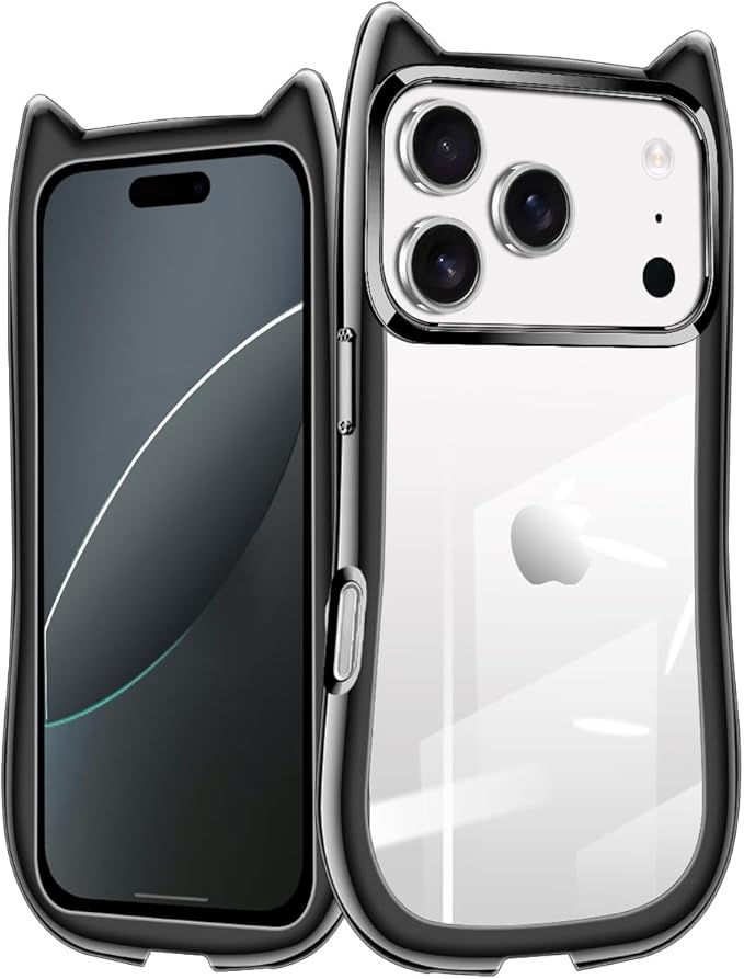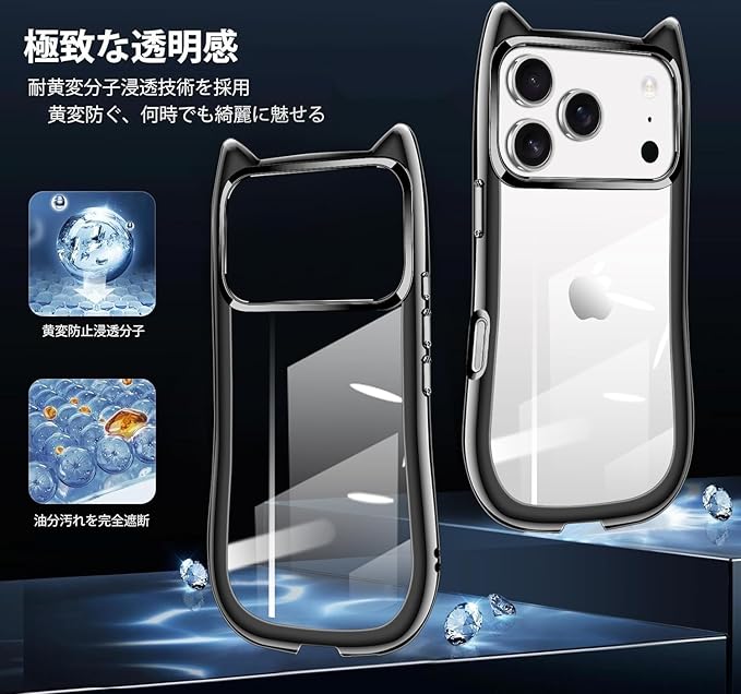 iPhone 17 Pro Max 専用 ケース クリア カバー TPU 可愛い 猫耳 ネコミミ かわいい おしゃれ ストラップホール アイフォン17プロマックス スマホケース 多機能 全面保護 落下防止(メッキブラック)