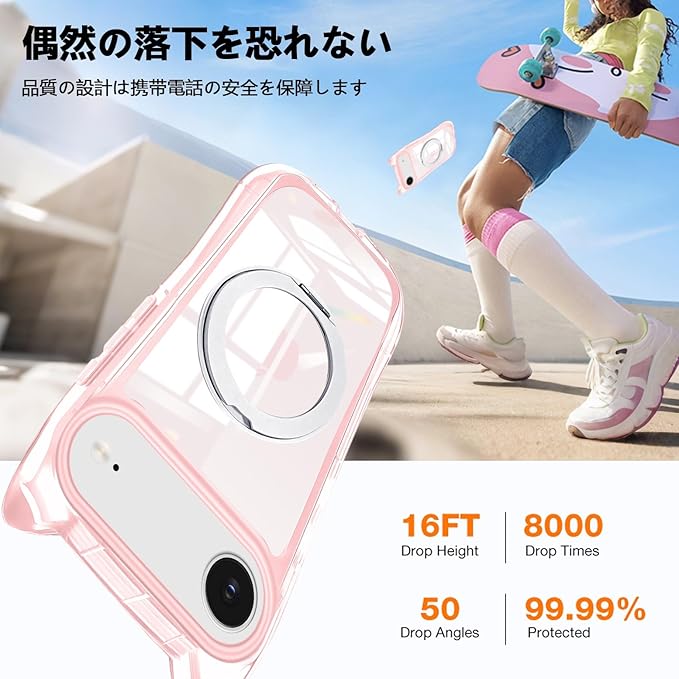 iPhone 17 Pro Max 用 ケース クリア リング付き 隠しスタンド 猫耳 ネコミミ アイフォン17 pro max ケース MagSafe対応 360度回転スタンド リング付き iphone 17 pro maxスマホケース TPU 縦横両対応 多機能 マグネット搭載 車載対応 可愛い 猫柄 カバー 韓国 おしゃれ アニメ 耐衝撃 黄変なし 米軍MIL規格 全面保護(ピンク)