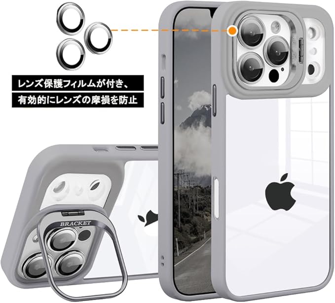 スマホケース 対応 iPhone 17 Pro Max クリアケース 透明 レンズスタンド付き スタンド機能 レンズカバー付き PC背面+TPUバンパー おしゃれ 耐衝撃 ストラップホール付き アイフォン17プロマックス 携帯電話ケース (グレー, 17 Pro Max)