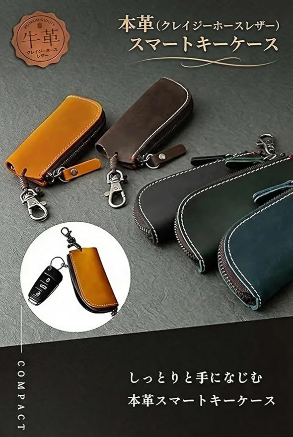 【本革クレイジーホースレザー】牛革の最表面の皮を使用したキーケース。牛革の最表面の皮は繊維が細かく、頑丈で耐久性にすぐれています。本革の中でもクレイジーホースレザーと呼ばれる革を使用して作られています。クレイジーホースレザーは品質の良い牛の原皮(馬の皮ではありません)を使用し、鞣した皮でしっとりとしたやや起毛したような質感が特徴的なレザーです。当スマートキーケースは起毛加工技術を採用し作られており、手触りが滑らかで耐久性にも優れています。「思わず誰かに見せたくなる」そんな革製品を目指して作りました。