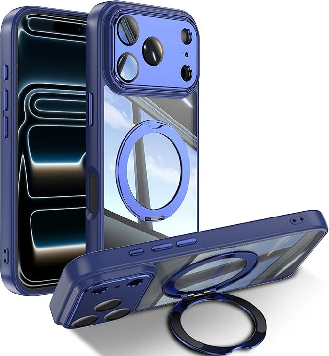 [ShinKin] スマホケース iPhone 17 Pro Max 用 ケース カバー 透明PC + TPU素材 ケース リング付き カバー スタンド機能 スマホケース 透明レンズフィルム保護機能付き 強化された保護 携帯電話のレンズフィルム 軽量 耐衝撃 擦り傷防止 落下防止 車載ホルダー 360 回転 ケース iPhone 17 Pro Max 用 (ブルー)