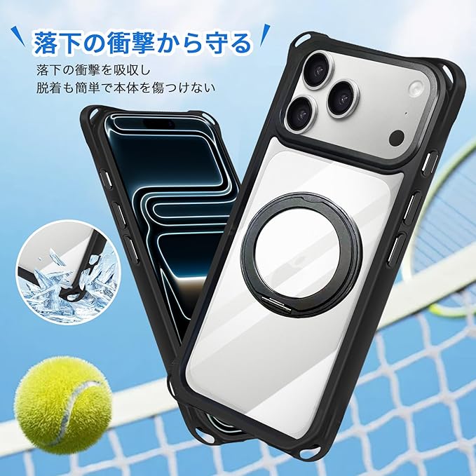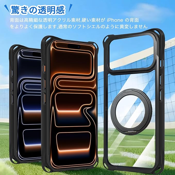 iPhone 17 Pro Max 用の ケース Magsafe対応 ワイヤレス充電 ショルダー クリア リング付き いphone 17 Pro Max 用の 肩掛け 斜めがけ 付き 縦/横 調節可能なショルダー トーラスホルダ スタンド機能 アイフォン 17 Pro Max 用の 360 回転 スマホケース ブラック