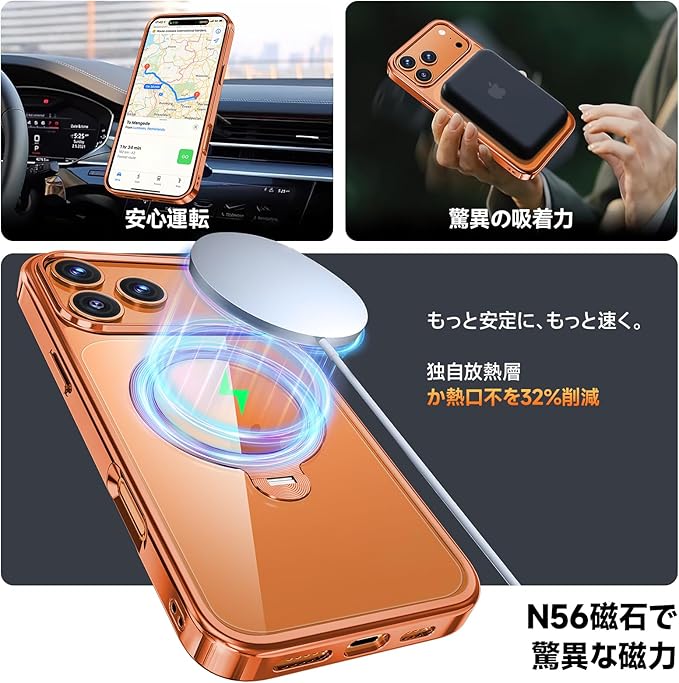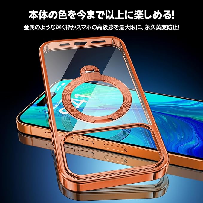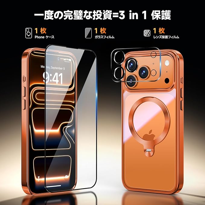 【三重保護セット!コズミックオレンジ限定】OYR iPhone 17 Pro Max用クリア ケース Magsafe 対応[360 回転CD スタンド・10 万回開閉テスト][メッキバンパー・iPhone専属色][カメラ保護とガラスフィルム付き]ストラップホール付き マグセーフ アイホン17プロマックスケース マホケース17 Pro Max 人気 米軍MIL規格・耐衝撃(6.9インチ・オレンジ)