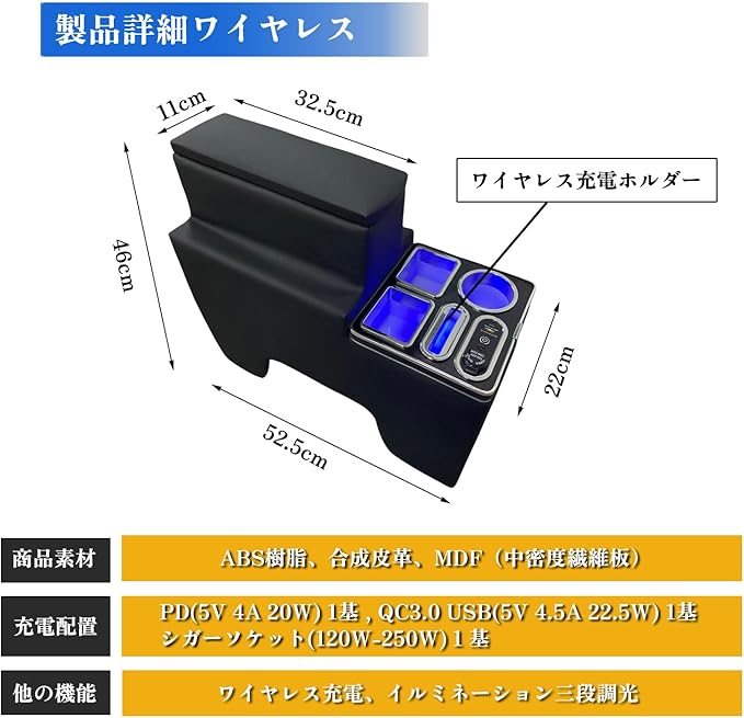 【Buy it】三菱デリカD:5専用 ワイヤレス充電 センターコンソールボックス|大容量収納&アームレスト|LED調光ライト搭載|USB3.0 & Type-C充電対応|スマホ&ドリンクホルダー|耐水仕様