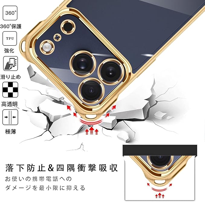 【高耐衝撃性・全面保護】カメラレンズの周りに段差をつけて擦り傷を防ぎます、平らな場所においても、液晶画面とカメラレンズに直接触れることがなく、ケース四隅のエアクッションデザインにより、ケースの四角を強化し、本体が落ちる場合に伝わる衝撃を吸収し、落下時の衝撃を最小限に抑えます、iPhoneを全方位からしっかり守れます。