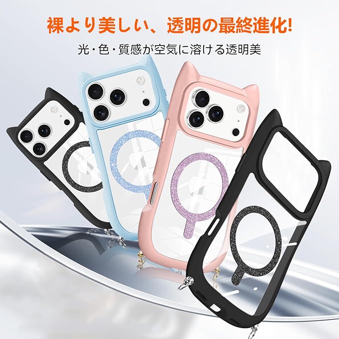 iPhone 17 ProMax ケース クリア ネコ ねこ リング マグセーフシール PC背面+ TPU ストラップ付き 肩掛けスマホケース ストラップ着脱可 いphone 17promax 携帯カバー 可愛い 人気 全面保護 耐衝撃 高質感