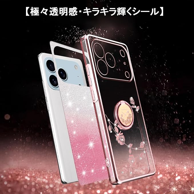 スマホケース 対応 iPhone 17 Pro Maxケース リング付き クリア キラキラ メッキ加工 花柄 ソフトケース TPU 薄型 おしゃれ かわいい 衝撃吸収 ブランド アイフォン17プロマックス カバー (ピンク)