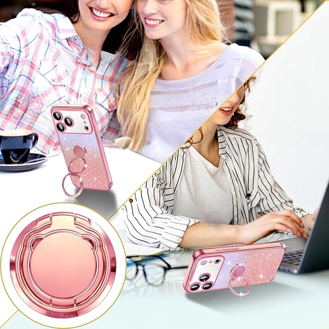 iPhone 17 Pro Max ケース ダブルリング付き グリッターカード&リストストラップ 17 Pro Max カバー 軽量薄型 キラキラ デザイン可愛い おしゃれ 女子向け レンズ保護 iphone 17 Pro Max スマホケース - ローズゴールド