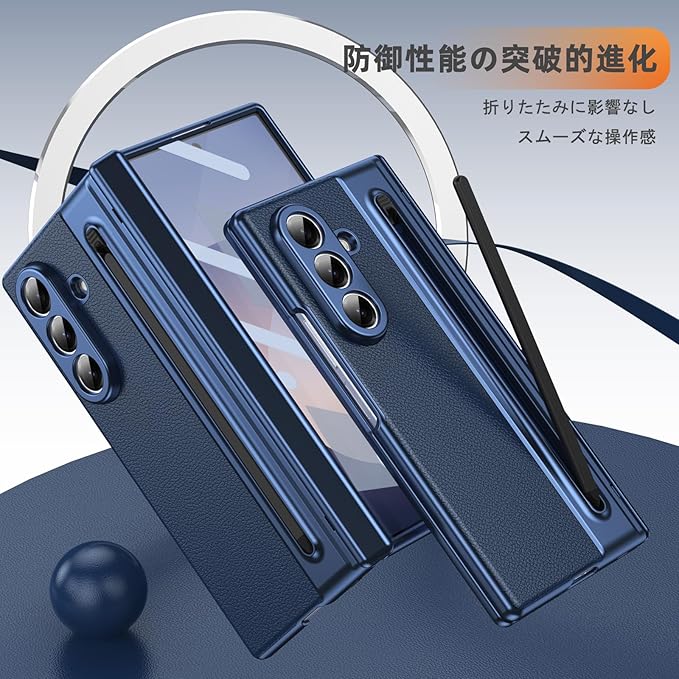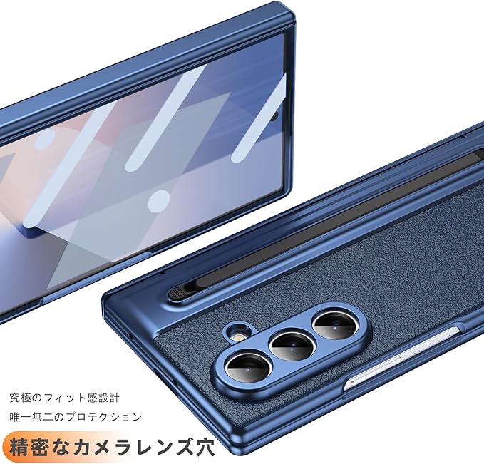 Galaxy Z Fold7 用 ヒンジ保護 ケース Samsung ギャラクシーZ Fold7 / SC-56F / SCG34 用 ペン付き レザーカバー 折りたたみ式 メッキ加工バンパー OURJOY スマホケース 硬度9H一体型ガラスフィルム 落下防止 カメラレンズ保護 耐衝撃 軽量 薄型 指紋防止 おしゃれ 人気・ブルー