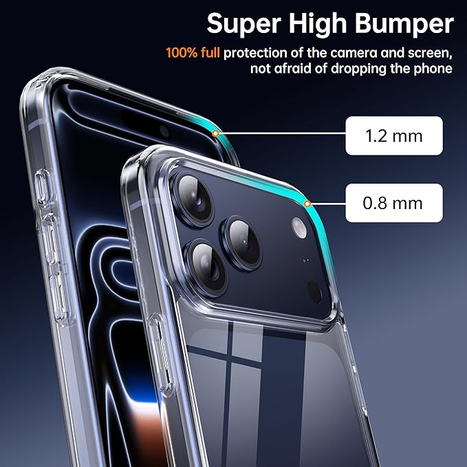 【米軍規格・SGS認証済み】Supdeal 防震透明スマートフォンケースは、iPhone 17 Pro Maxと互換性があります。このケースは、米軍のMILテストおよびSGS落下試験の認証を取得しています。突起したベゼルは、画面とカメラを跌落や傷から保護し、カメラ部分には0.8mmのベゼル、画面部分には0.2mmのベゼルがあり、絶対に信頼できる製品です。