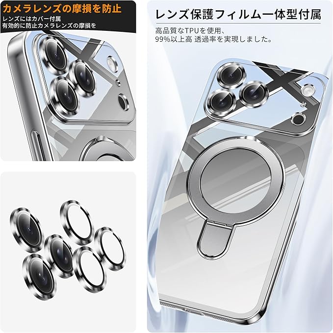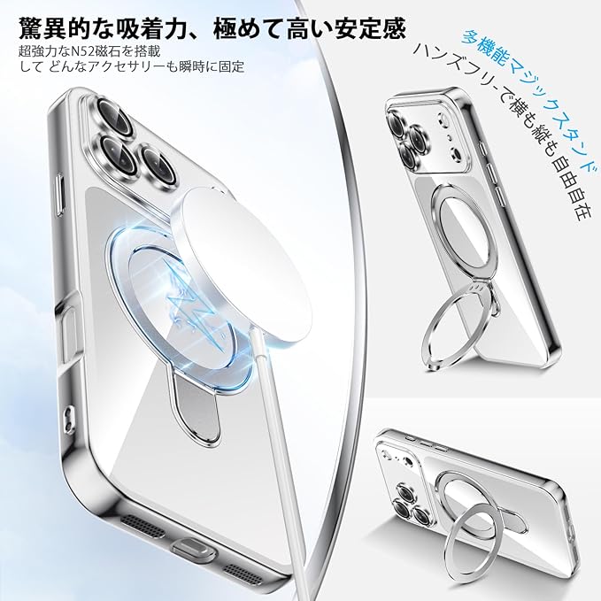 対応 iPhone 17 Pro Max 用ケース 強力マグネット スタンド機能付き 耐衝撃 magnetic 背面クリア TPU 軽量 薄型 ワイヤレス充電 米軍MIL規格 隠し収納式 多機能一体スタンド メッキ加工 スマホケース (銀) 26-ip17pm-02
