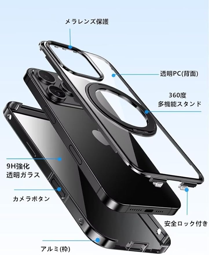 素材:クリア 9H強化ガラス(前面)+アルミ(枠)+透明PC(背面)。ご注意 : 本製品自体は液晶画面保護ガラス付きなので、別途ガラスフィルムを貼らないでください。
