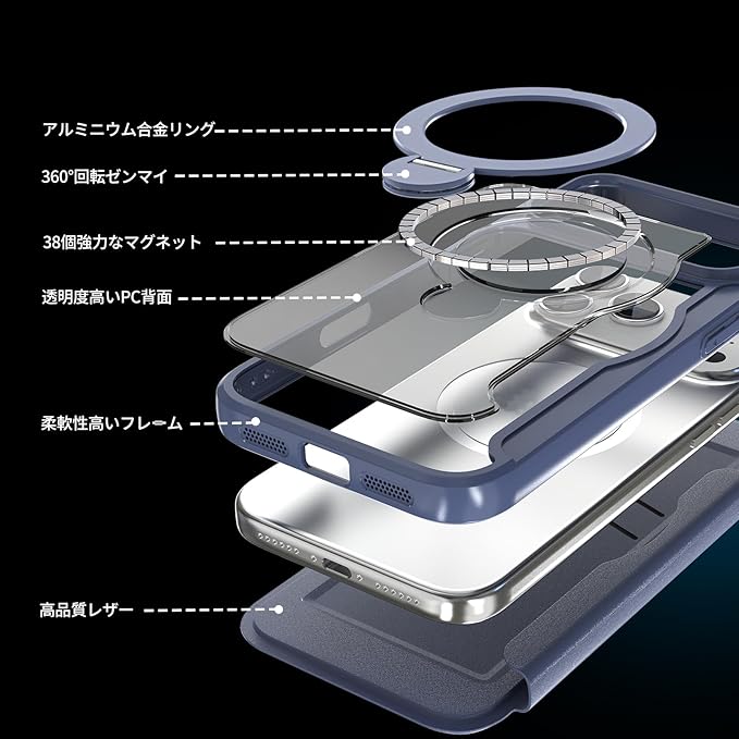 材質 アルミニウム合金リング 360 回転ゼンマイ 38個強力なマグネット 透明度高いPC背面 柔軟性高いフレーム 高品質レザー