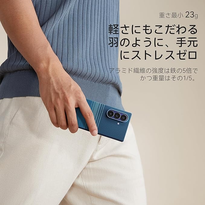 【0.96mm薄さ-ストレスフリーな使い心地】厚さわずか1.2mm、重さ約23.7gの超スリム設計。アラミド繊維は軽量でありながら高い強度を持ち、鉄のような強靭さを誇りますが、その重量はわずか四分の一程度です。長時間スマホを手にしていても手が疲れにくく、日常使いに最適。ミニマルなデザインがスマートフォンの美しさをそのまま引き立てつつ、しっかりと保護してくれます。ポケットやバッグの中でもかさばらず、快適な携帯性を実現します。