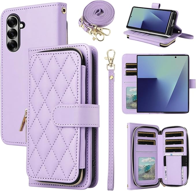 Elisorli for Samsung Galaxy Z Fold 7 手首/ショルダーストラップ カードスロット ジッパー財布 豪華 PUレザー スタンド ための 携帯電話のカバー 持つ ZFold Z7 G Fold7 7Z ウォレットケース しい 大人人気 お洒落 ケース 手帳型 スマホケース カバー スマートフォン 耐久性 耐衝撃 フラップ ストラップホール カード収納 女 むらさき