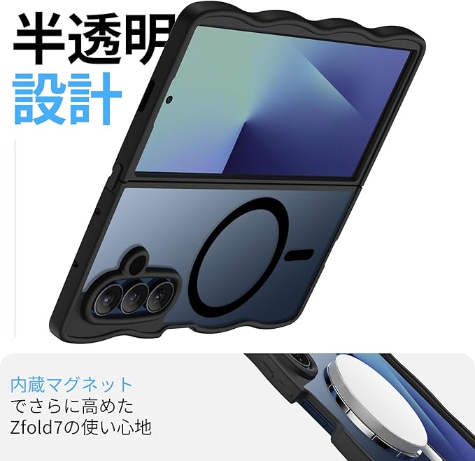 Galaxy Z Fold 7 用 ケース 耐衝撃 米軍MIL規格 半透明 波形 ワイヤレス充電対応 指紋防止 黄ばみ防止 滑り止め ギャラクシー Z fold7/SC-56F/SCG34 カバー (ブラック)N523-zfold7-01