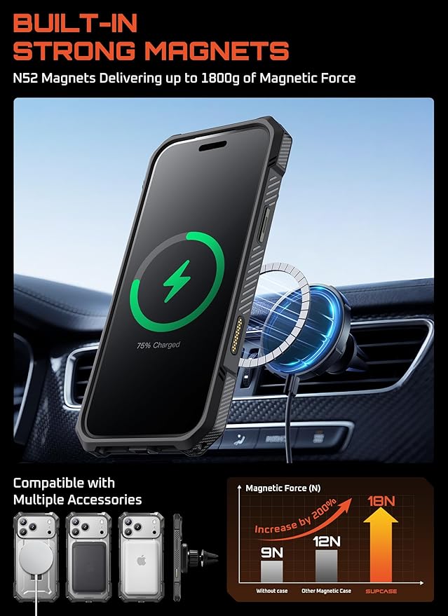 【MagSafe対応】:強力なN52マグネットを搭載し、最大1800gの磁力を発揮し、MagSafeアクセサリー(マグネット車載ホルダー、MagSafeワイヤレス充電器、マグネットカードホルダー、デスクトップ用マグネットワイヤレス充電スタンドなど)とのシームレスな互換性を確保します。
