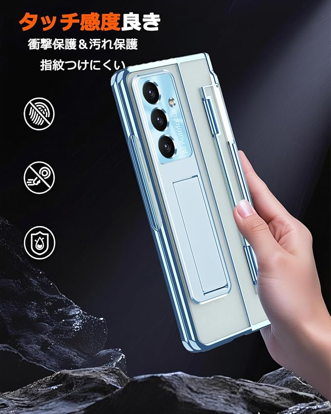 NINKI適応Galaxy Z fold 7ケース 【 SC-56F | SCG34 】 ペン付き penホルダー キックスタンド フィルム一体型 クリア背面 メッキ加工 PC製 おしゃれ 折り畳み式 サムスン ギャラクシー フォールド 7 5g スマホ ケース(ブルー)