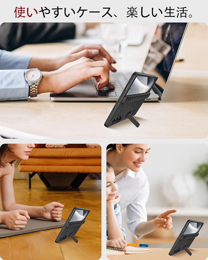 【隠しスタンド|ヒンジ保護】スタンドが巧みに隠され、開閉スムーズで多角度に調整可能。動画視聴や通話、作業時に両手を解放して快適使用,デザインも美しく保たれる。先進的な磁気ヒンジ保護技術により、完璧に密着しながら傷や落下から全方位で機器を守ります。隆起した縁と背面カメラ用の保護構造が、画面とカメラを一層確実に保護します。