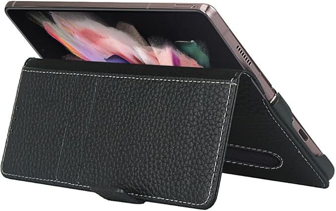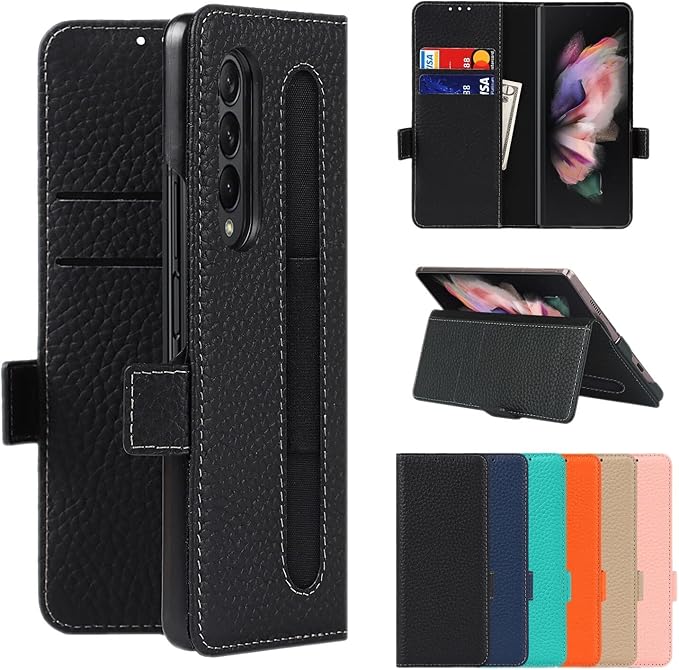 for Galaxy Z Fold3 5G ケース SC-55B SCG11 手帳型ケース Sペン収納付き 手作り柔らかい 牛革製品 本革レザー Pelanty サムスン ギャラクシー Z フォールド3 5g 携帯カバー ペンホルダー 財布型 カード収納 スタンド機能 内蔵マグネット 耐衝撃 [ブラック]
