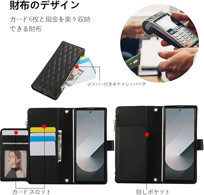 多機能:当社のGalaxy Z フォールド7 ケース ショルダーは、映画鑑賞やビデオ通話のときにスタンドに折りたたむことができます。5つのカードスロット、1つの隠しポケット、1つのジッパーウォレットを備えています。銀行カード、IDカード、名刺、現金、運転免許証、その他の日用品を収納できます。お客様の財産の安全を確保することは私たちの主な関心事です。そのため、SC-56Fは内部に耐磁性干渉材料を使用しているだけでなく、「RFIDブロック機能」などのセキュリティ対策も備えており、重要な個人情報を保護します