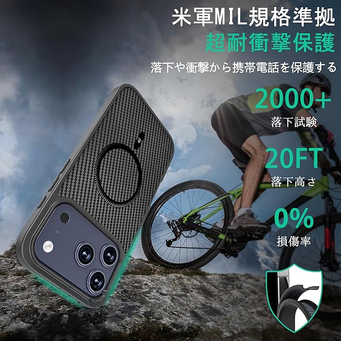 【二重構造 でしっかり保護】多重複合構造を採用し、四周は柔らかいシリコン素材、背面は内側に硬質PC、外側にカーボンファイバー調の硬質パネルを組み合わせ、端末を全方位からしっかり保護します。ケース 縁を画面・カメラより高く設計し、四隅の衝撃吸収で落下時のダメージを軽減できます。米軍MIL規格準拠の耐衝撃性能で、落下時の衝撃を効果的に吸収します。特別に強化され、通勤中の電車での手滑りや、デスクからの落下、ベッドサイドでの滑落など、日常の“うっかり”から大切なiPhone17ProMaxを守ります。